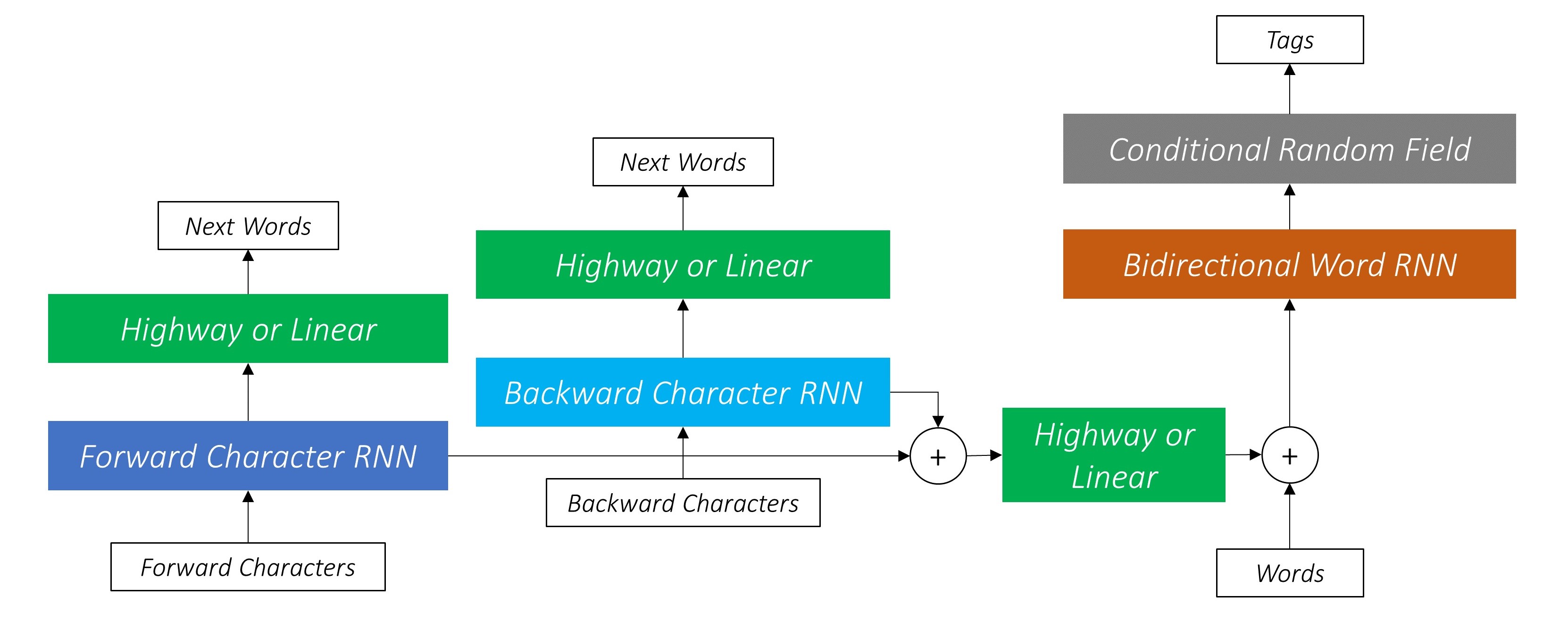 In a nutshell, we have 3 streams of information being fed into the word-level bi-lstm: the feature extraction from forward character-level lstm, the feature extraction from backward character-level lstm, and the word-level information itself.